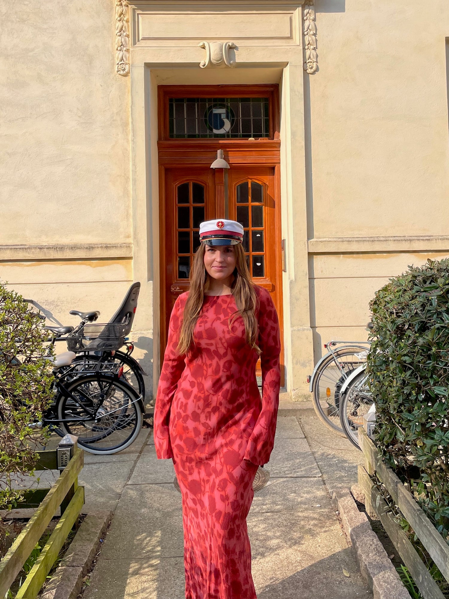 Lang, figursyet og i det smukkeste røde print – den her kjole taler for sig selv.