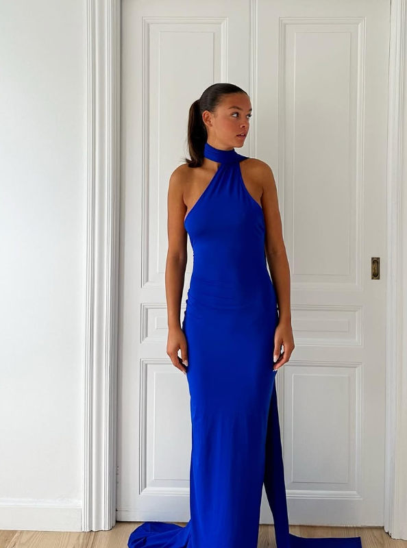 Denne kongeblå kjole er definitionen af dramatisk elegance. Med sin høje halterneck, åbne ryg og side-cutouts skaber den en skulpturel silhuet, der balancerer styrke og ynde. Det lange slæb, der falder fra nakken og glider hen over gulvet, tilfører et royalt udtryk, mens den tætsiddende form fremhæver kroppens linjer med selvtillid.