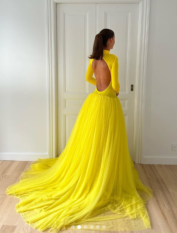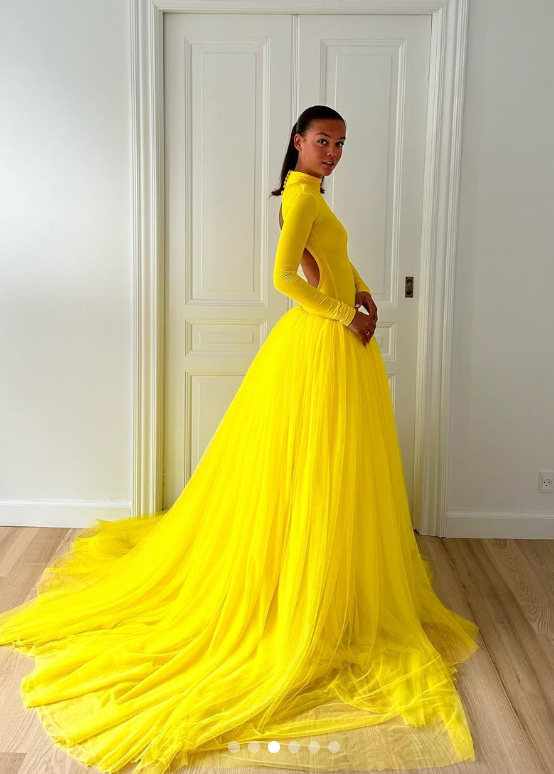 Denne solgule kjole er et levende statement af lys og elegance. Den tætsiddende overdel med lange ærmer og høj hals skaber en sofistikeret kontrast til det overdådige tylskørt, der breder sig som et drømmende slæb hen over gulvet. Side-cutouts og åben ryg tilføjer et moderne twist, mens den klare farve lyser op i ethvert rum.