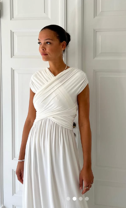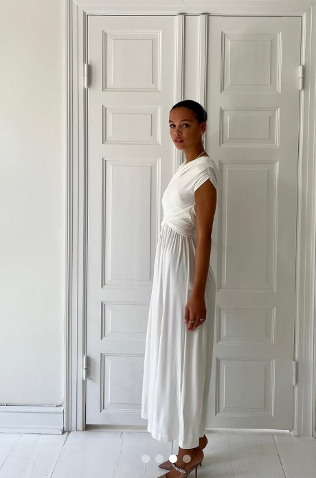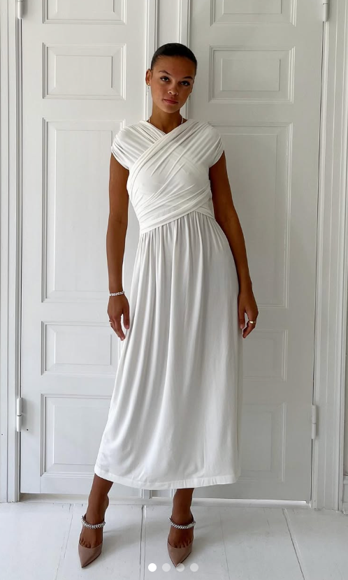 Denne kjole er definitionen af underspillet elegance. Den draperede overdel og de fine cap sleeves skaber en klassisk og sofistikeret silhuet, mens den gathered talje og flydende nederdel tilfører bevægelse og ynde. Den rene hvide farve fremhæver detaljerne i konstruktionen og giver et tidløst udtryk, perfekt til både formelle og romantiske lejligheder.