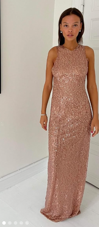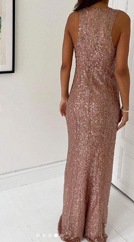 Denne kjole er ren stjernestøv. Den rosaguld farve glitrer med hver bevægelse, og den tætsiddende silhuet fremhæver figuren med elegance og styrke. Den høje hals tilfører et sofistikeret og moderne snit, mens det gulvlange fald skaber en flydende, næsten filmisk effekt. Et perfekt valg til aftener, hvor du vil være både glamourøs og uforglemmelig.