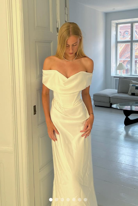 Denne kjole er definitionen af tidløs elegance. Den off-shoulder halsudskæring og det draperede snit skaber en flydende silhuet, der balancerer ynde og struktur. Satinens glans fremhæver hver bevægelse, og den diskrete gathering i taljen tilfører form uden at fjerne letheden. Perlehalskæden fuldender looket med vintage-romantik og subtil luksus.
