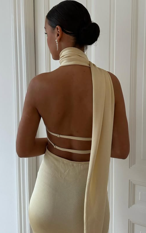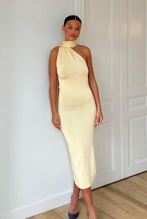 Denne lysegule kjole er et studie i moderne minimalisme med et kunstnerisk twist. Den asymmetriske halterneck og den draperede skulderdetalje skaber et skulpturelt udtryk, mens den tætsiddende silhuet og åbne ryg tilfører et strejf af sensualitet. Stoffet falder blødt og elegant, hvilket gør den ideel til både formelle lejligheder og stilfulde sommerfester.