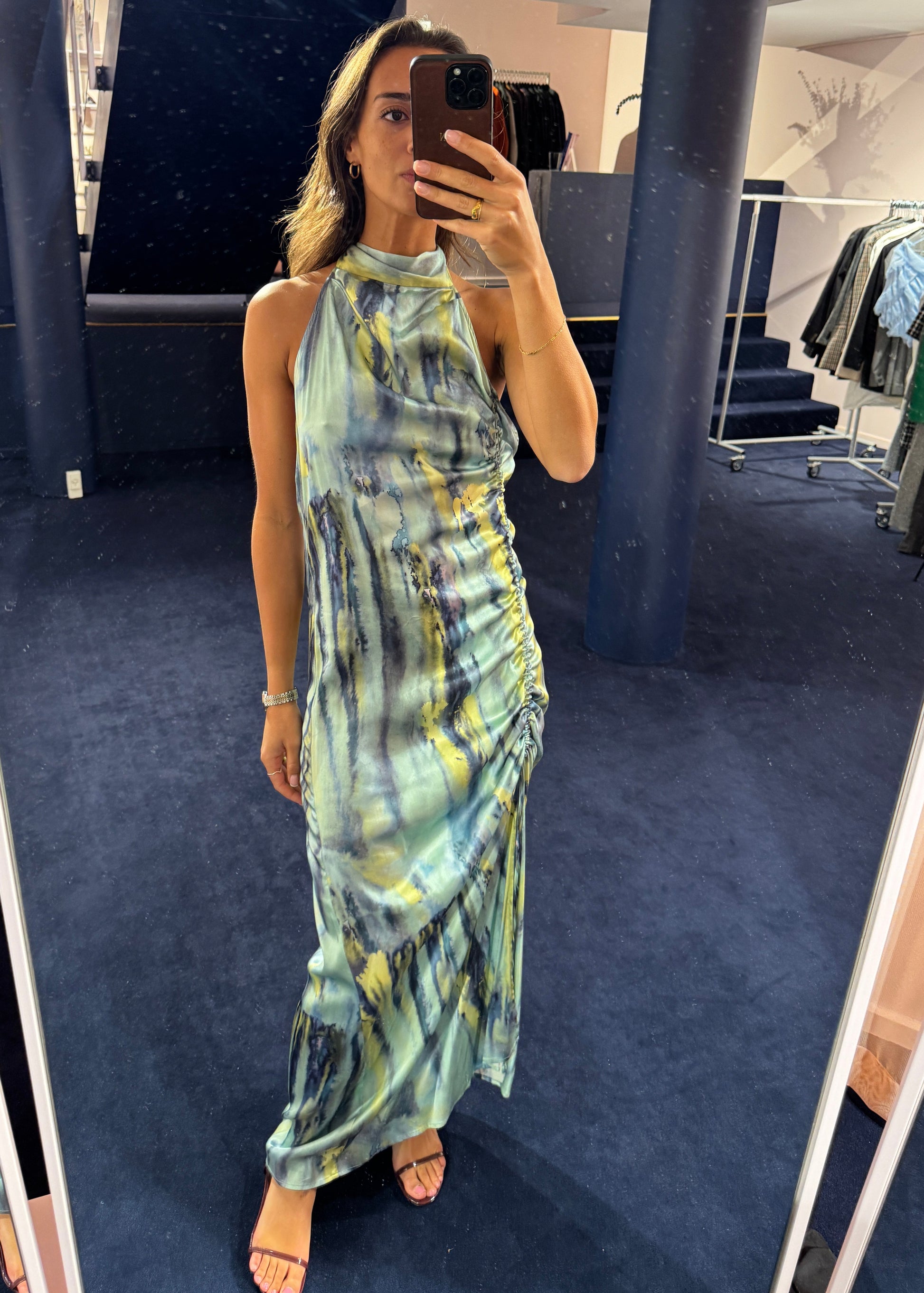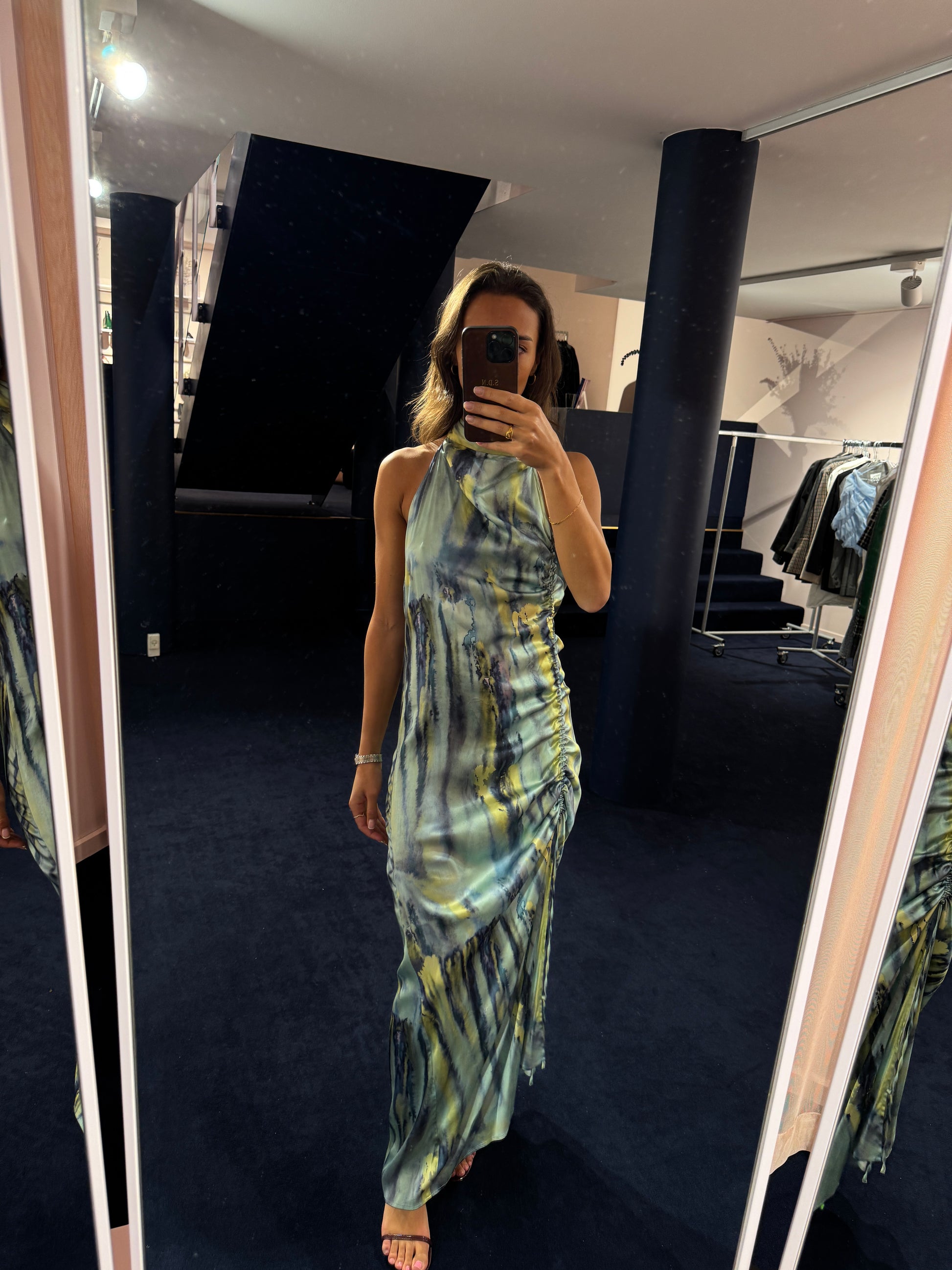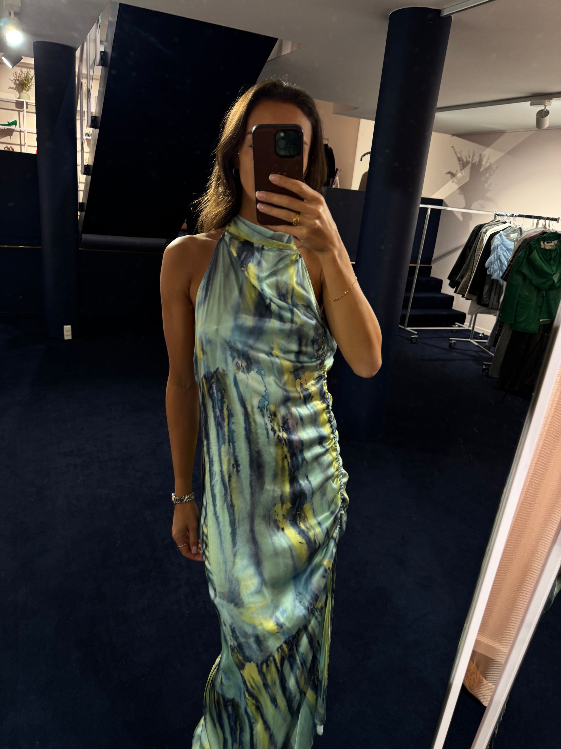 Eksklusiv maxikjole fra Gestuz i str. 38. Kjolen har et elegant halterneck-design med åben ryg og smukke draperinger, der fremhæver figuren på en sofistikeret måde. Det unikke mønster i blå, grønne og gule nuancer giver et levende og eksklusivt udtryk.