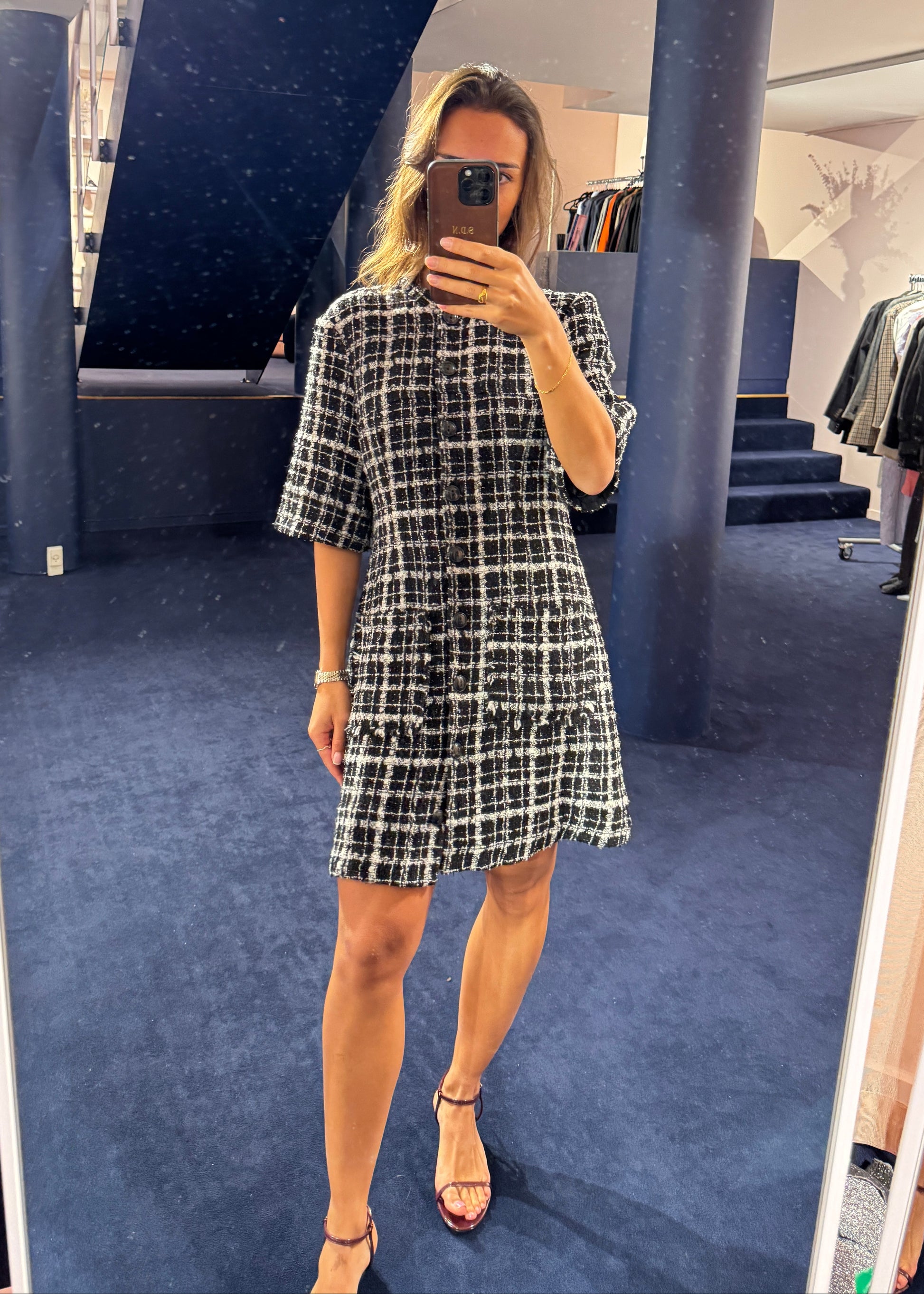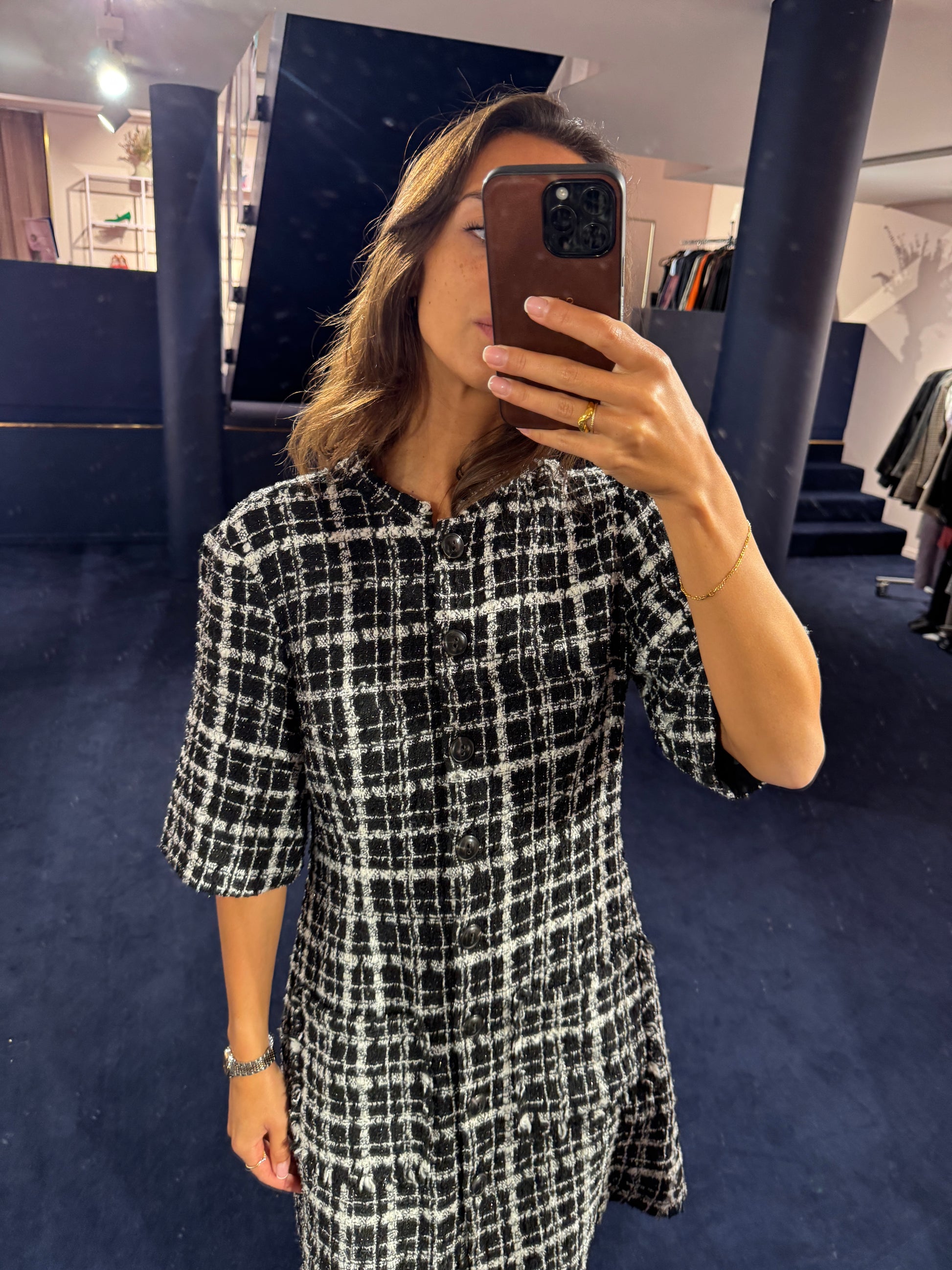 Klassisk kjole fra Baum und Pferdgarten i str. 40. Kjolen har et elegant sort-hvidt ternet mønster i en blød, struktureret kvalitet, der giver et eksklusivt udtryk. Den har korte ærmer, rund hals og en let A-formet silhuet, som falder flot og giver en behagelig pasform.